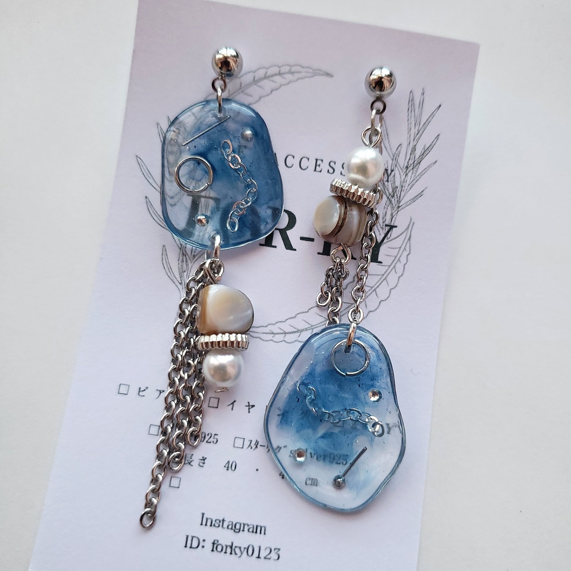 【1点もの】くねくねシルバーレジンパール ブルー ピアス / イヤリング