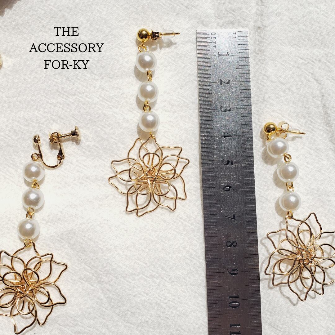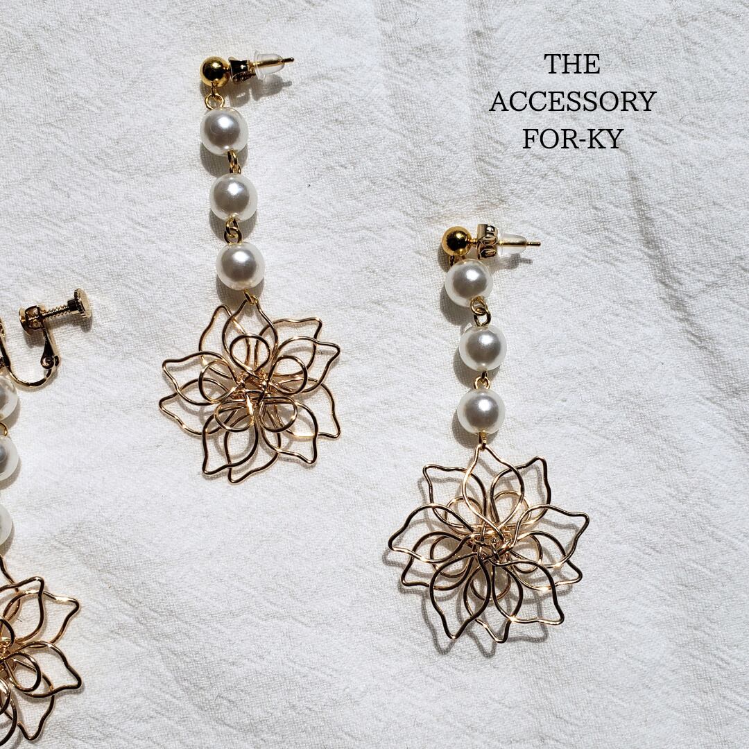 [ イヤリング or ピアス ]3連パール ワイヤーフラワーGD